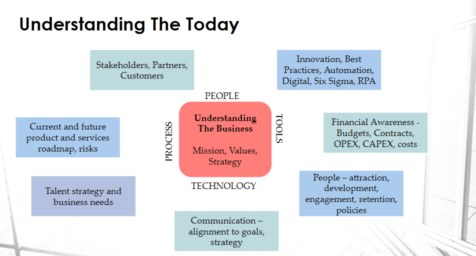 Let’s look at Today – every leader needs to understand the business as it is today. Who are the stakeholders, the partners (vendors) and the customers? Where does the revenue flow in from and how are we doing there? What is the feedback from our customers and how does that relate to what the employees are saying on the ground – etc etc. I hope you are getting my steer.